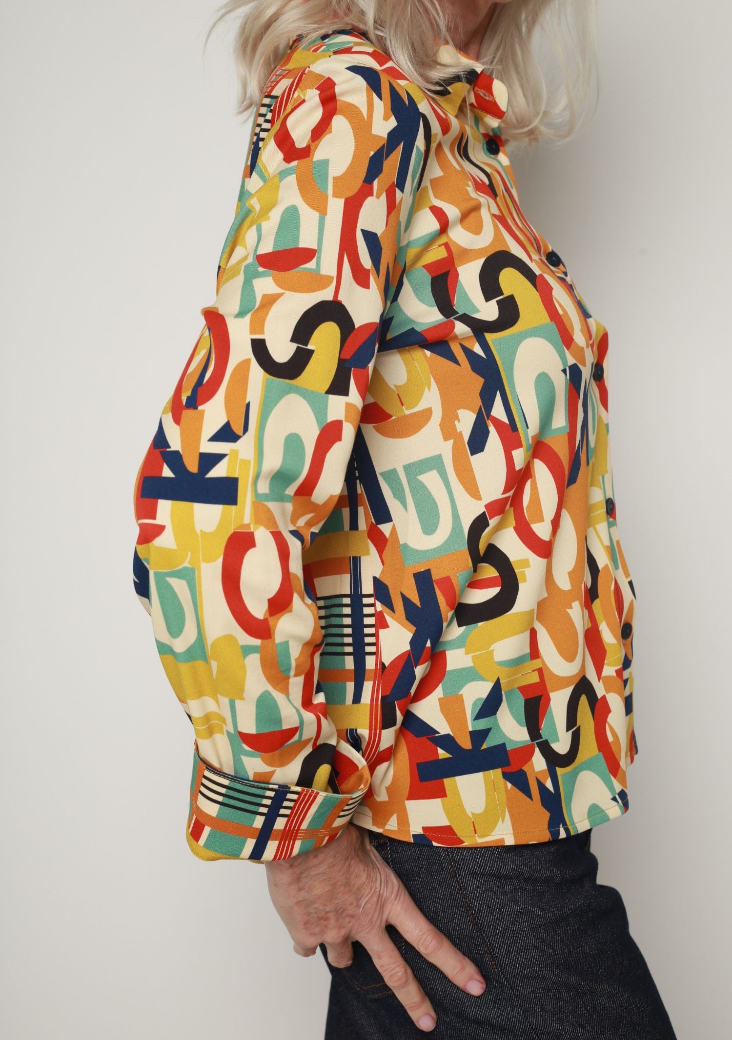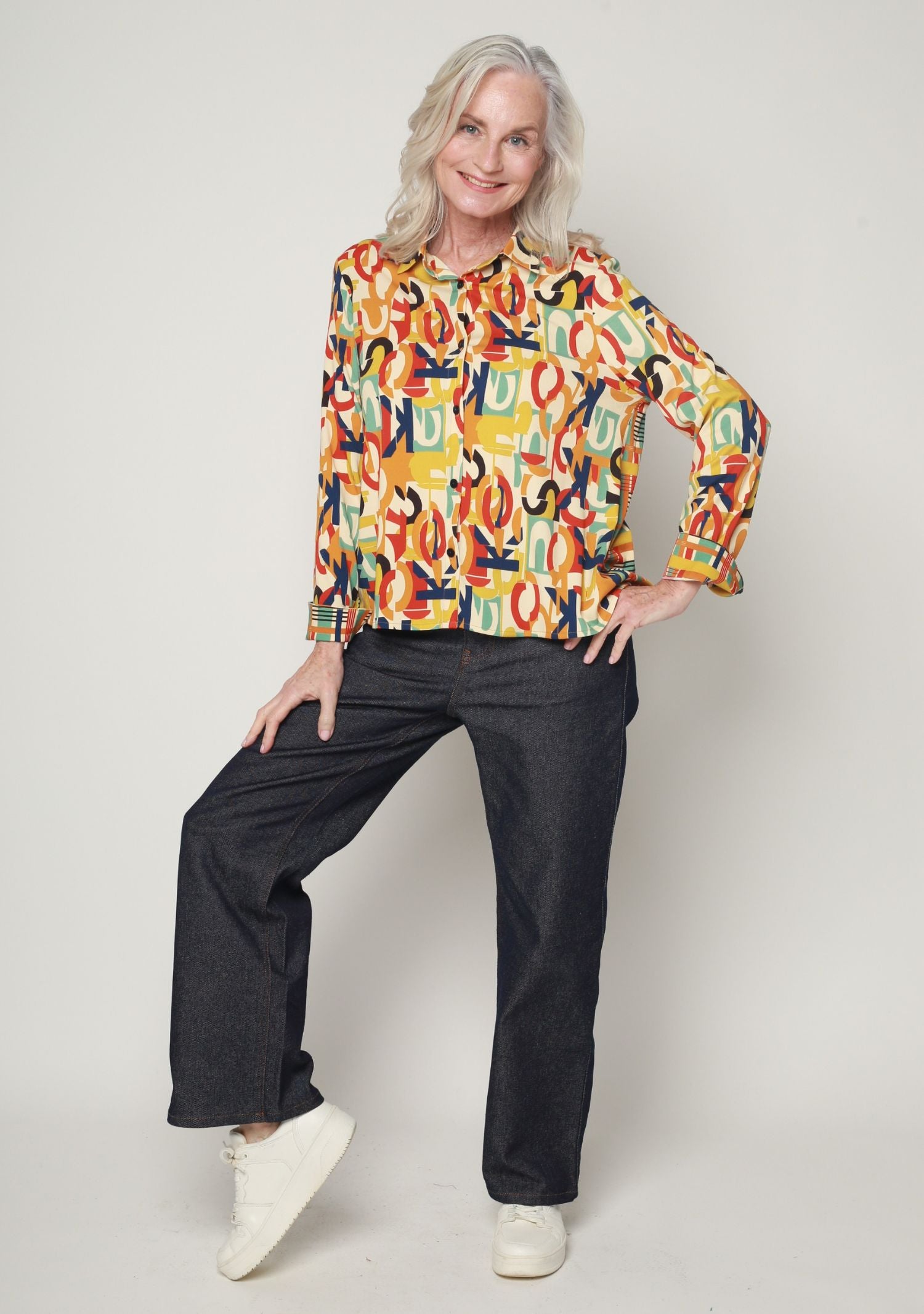 INFOS ARTISTE ET MOTIF : La Chemise Chelo Alphabet Écru se distingue par sa coupe droite polyvalente, à porter aussi bien rentré dans un pantalon que par-dessus une jupe. Le motif, imaginé par Design Union, fait danser des lettres dans un jeu de géométrie et de couleur, recoloré dans des tons nordiques à base d’écru. Parfaitement harmonisé avec un motif à carreaux "Oslo", ce chemisier est un choix élégant pour un style unique et moderne.