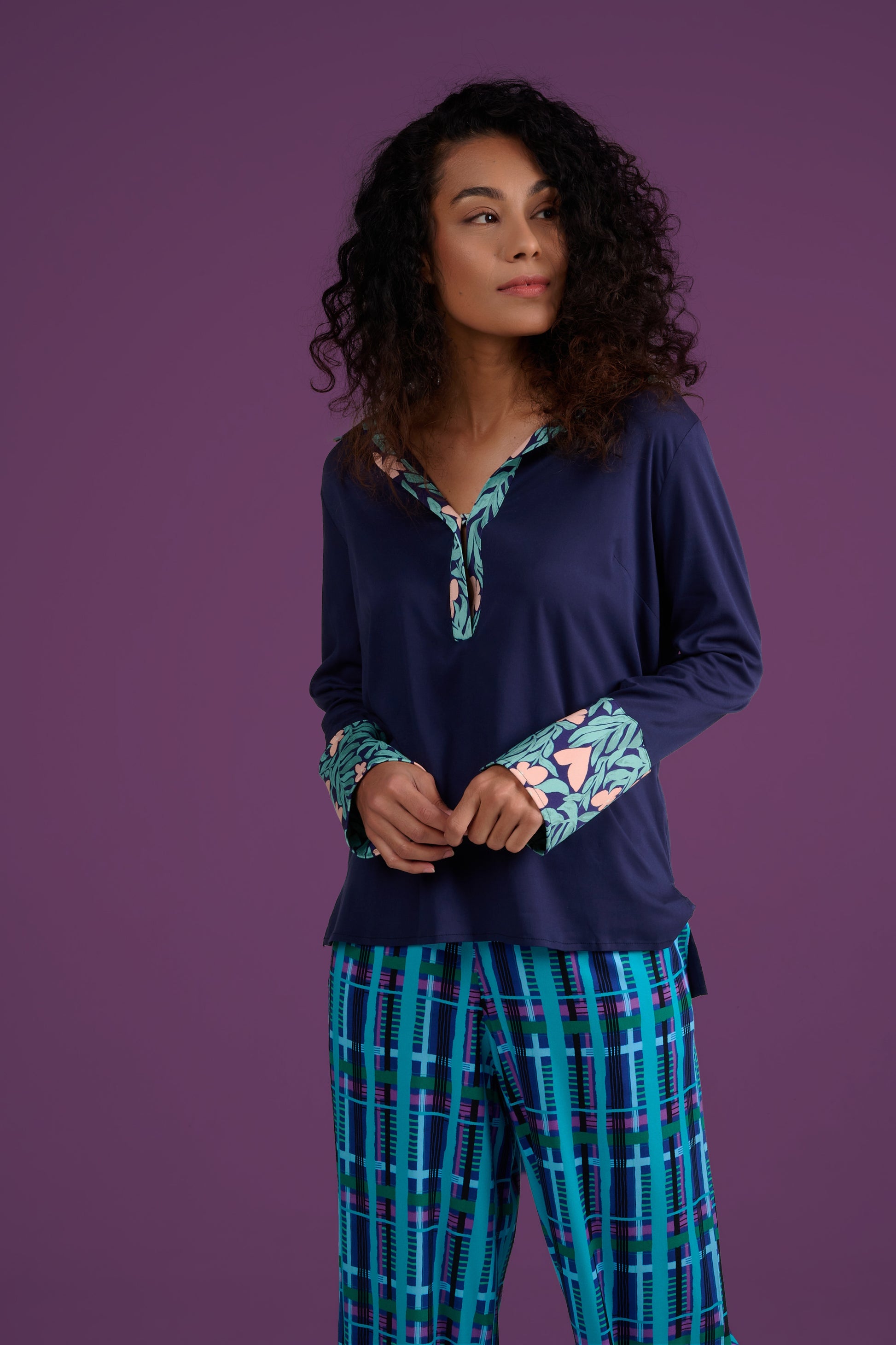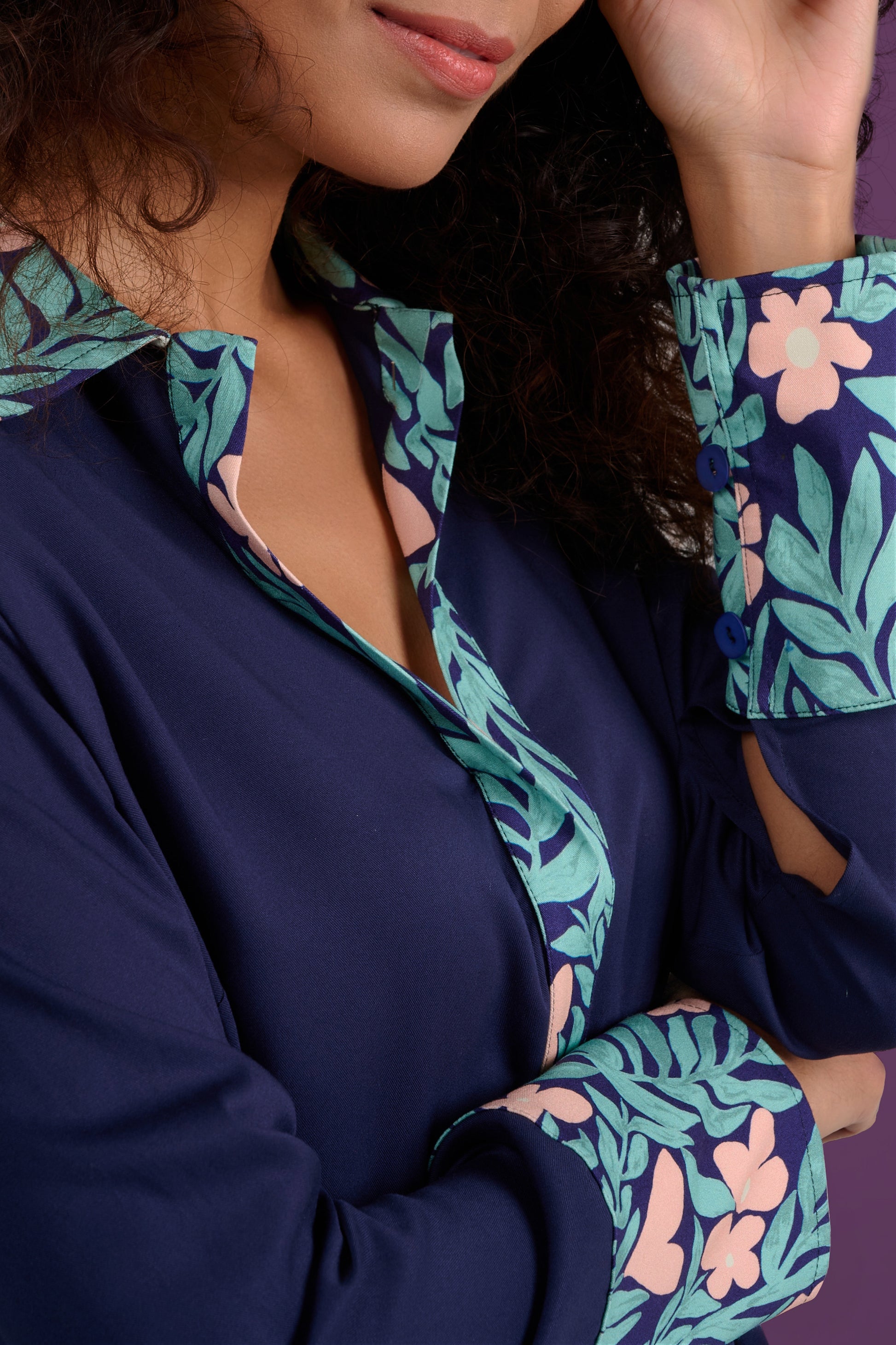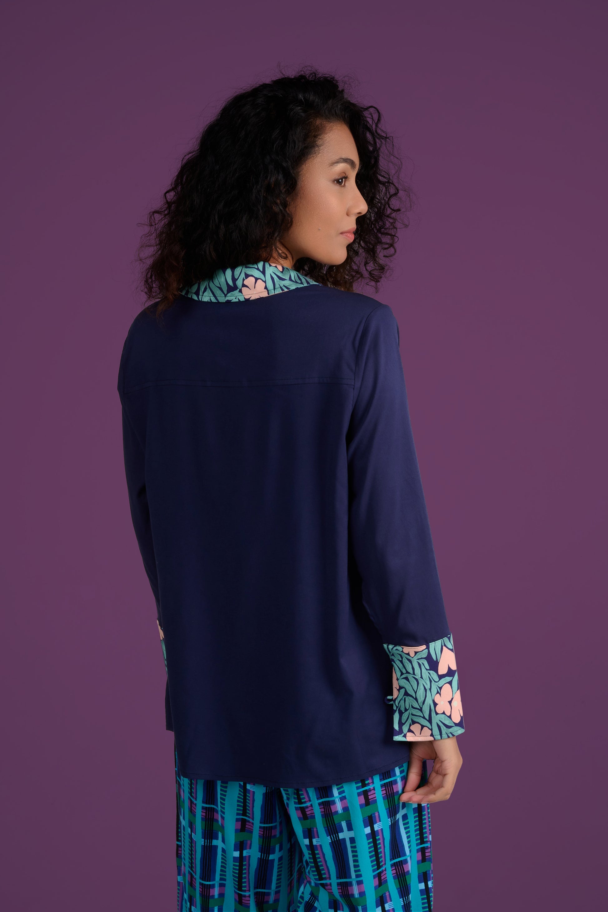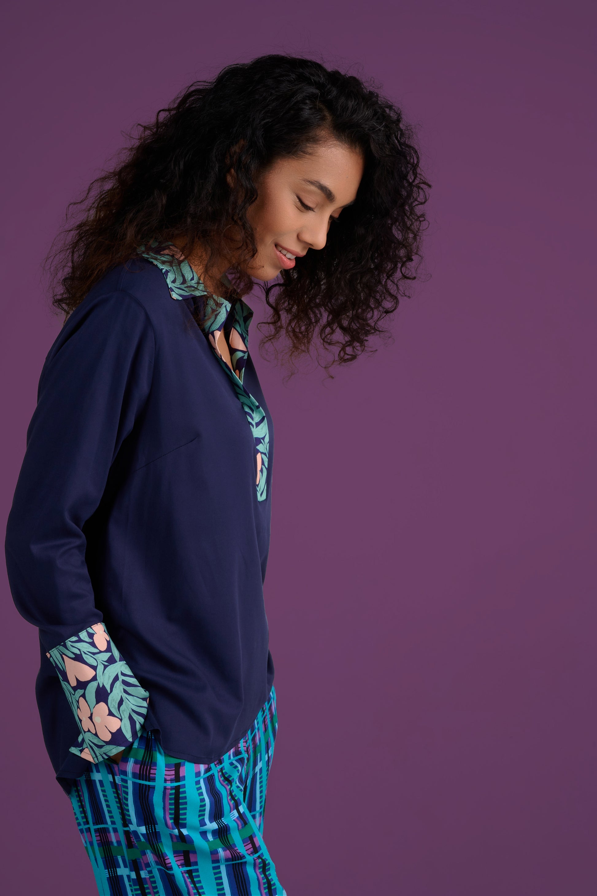 INFOS ARTISTE ET MOTIF : Le chemisier se porte sur le pantalon sans donner le côté sérieux de la chemise Do you speak “garden” L’artiste américaine Marika Kandelaki a peint ce décor et nous enveloppe d’un lierre fleuri. À la manière des jolis papiers peints d’antan en plus jeune et rafraichissant. Avec ce motif on vous emmène dans les jardins anglais, ou la liberté de pousser laisse libre cours aux plantes pour grimper partout, les murs des maisons sont leur terrain d’expression favorite.