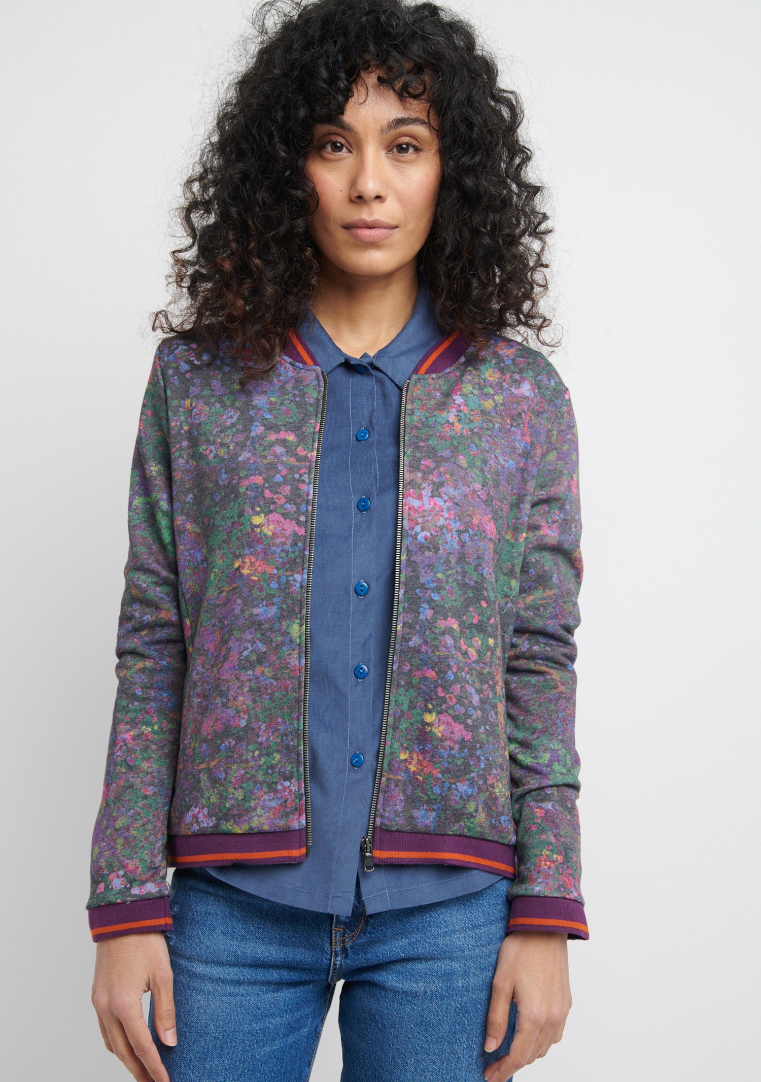 Bomber à porter comme une veste, au dessus de vos top ou chemise. Le mannequin mesure 1m75, fait un 36 et porte la taille M. Si vous faites un 40 optez pour le M et ainsi de suite.