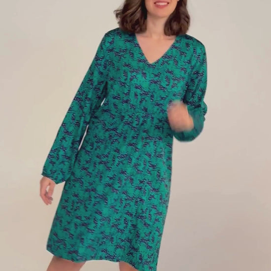 Robe mi-longue avec un col V, bleu et vert ceintrée, élastiquée à la taille. Manches légèrement ballons.