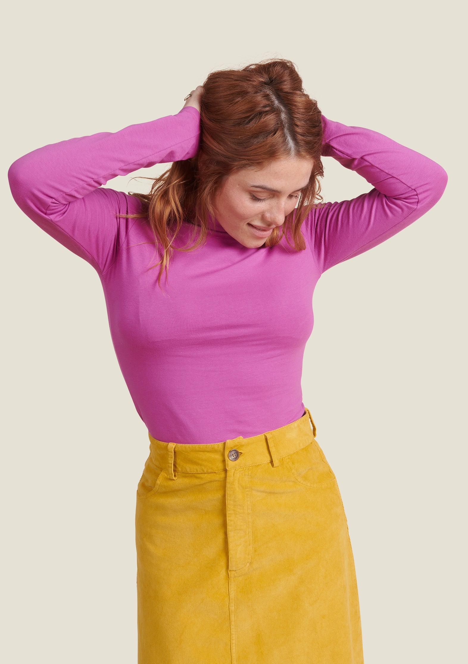 Avec sa maille jersey douce et extensible, ce sous-pull col roulé s’associe facilement à tous nos imprimés. Idéal pour superposer avec style et confort.