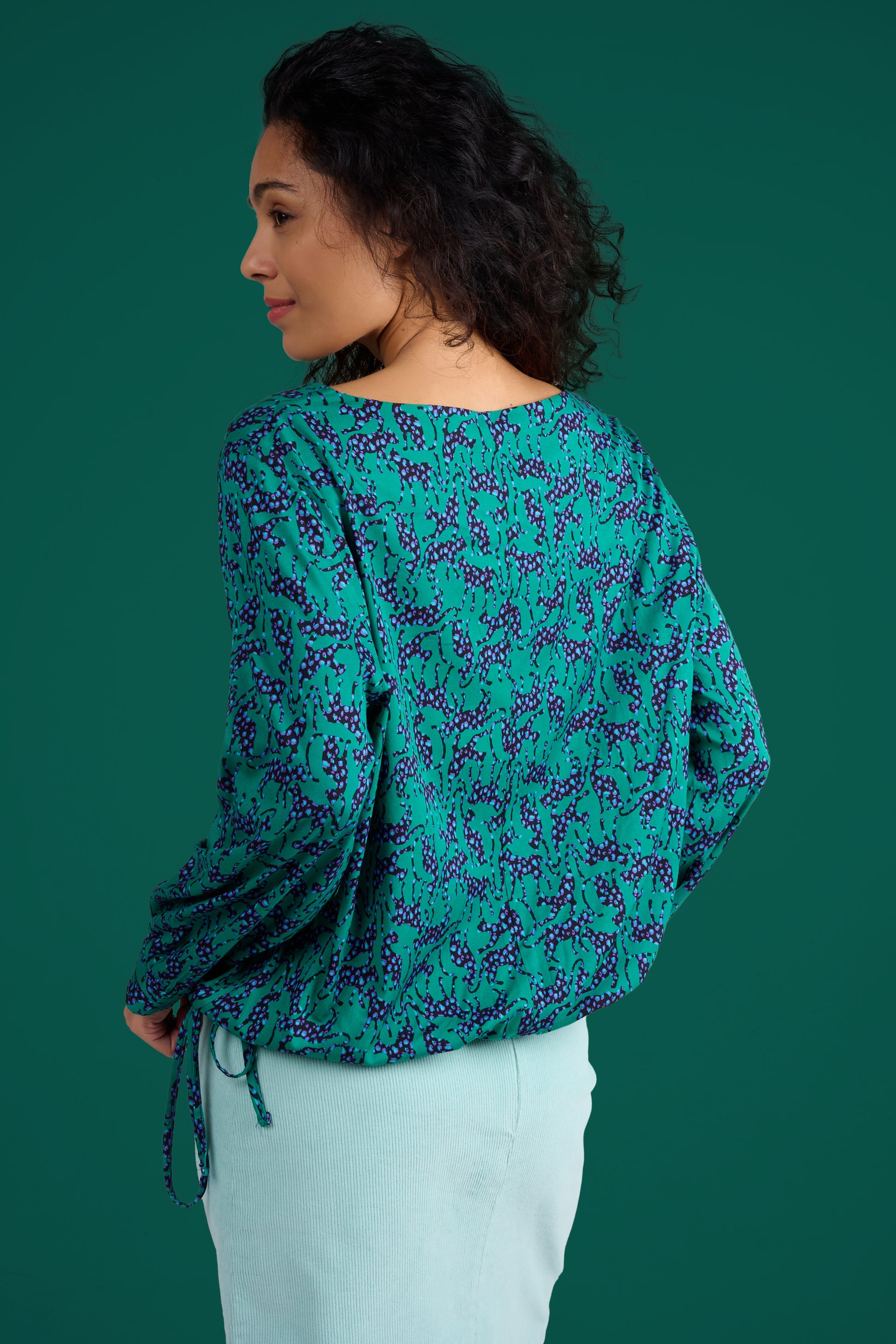 Top blousant fluide à manches longues resserrées aux poignets, col rond et ajustable à la taille.