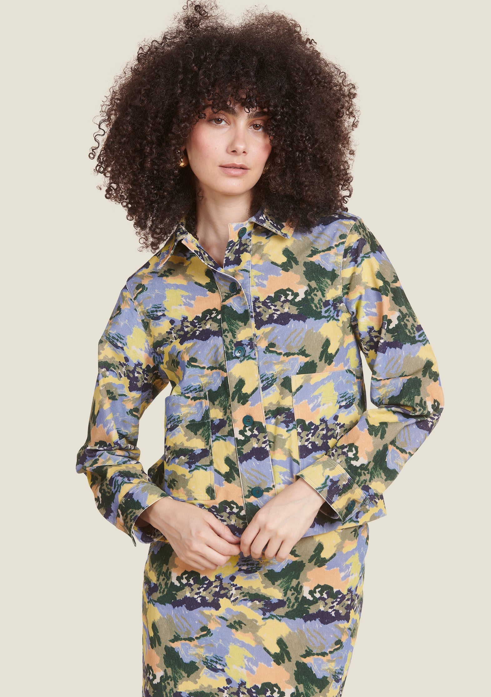 L’imprimé Orages Bleu imaginé par Beya capture la lumière d’un ciel d’orage en mouvement. Cette veste en velours mini-côtelé est douce, confortable et pleine de caractère.